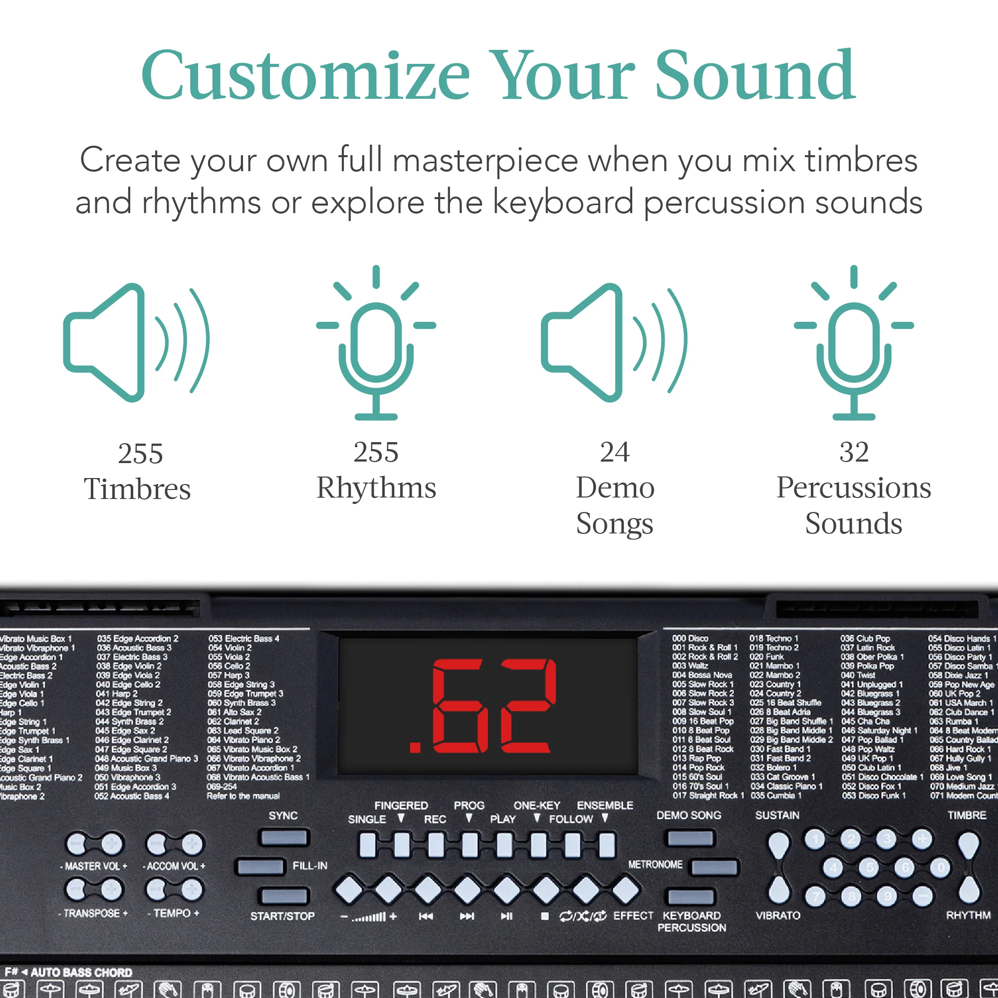 CUSTOMIZABLE SOUND: Draw inspiration from the 24 demo, then use the 255 timbre options to create different sounds and the 255 rhythms to accompany your melody along with 32 percussion sounds