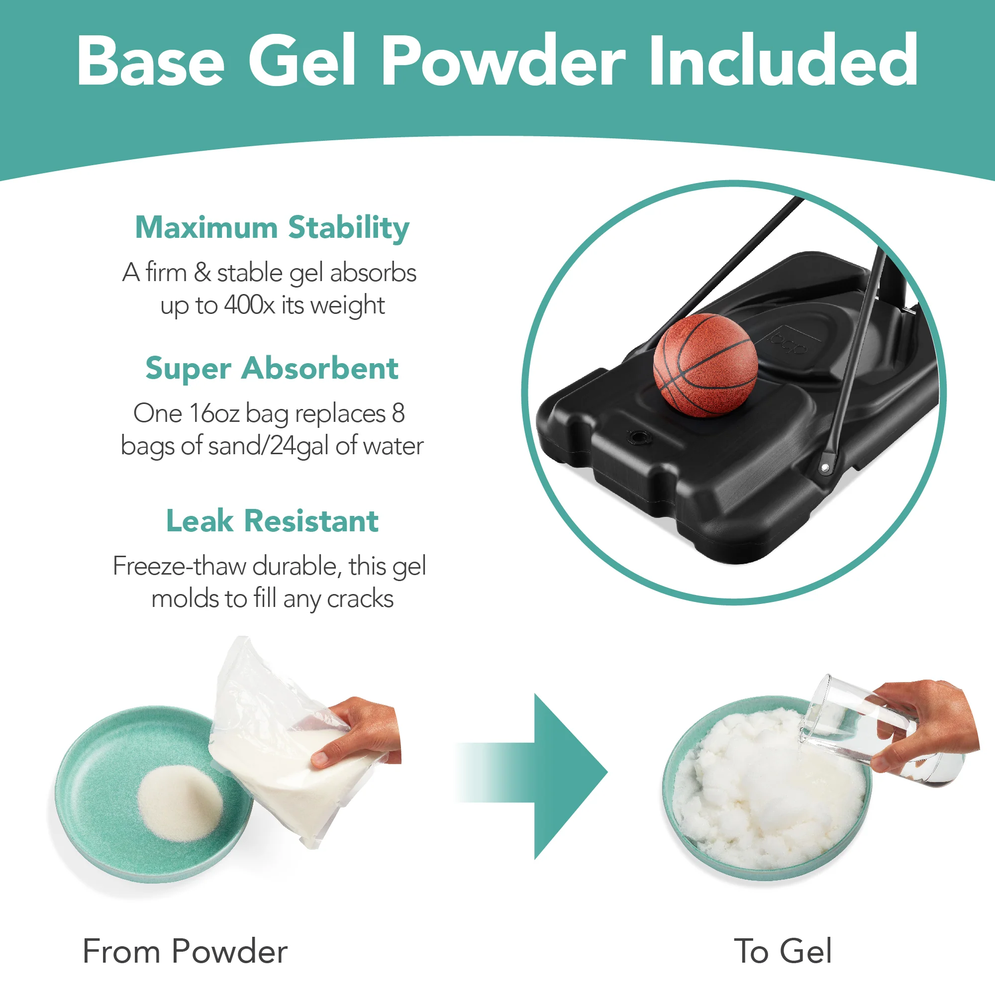 BASE GEL POWDER INCLUDED: A bag of simple, absorbent gel powder replaces and outperforms lone water or sand; just combine the gel powder and water in the base for maximum stability
